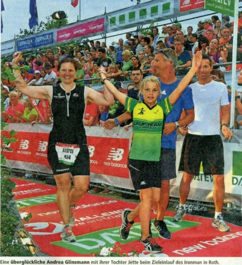 VON MANFRED KRAUSE RHADE. Der Triathlon in Roth, eine der größten Veranstaltungen der Welt über die Langdistanz, zog erneut die Massen an. Bei der „Challenge Roth" gingen 4000 Teilnehmer aus 50 Ländern an den Start. Mittendrin die Rhaderin Andrea Glinsmann: Die 38-Jährige, die beim Lauftreff des SV Eintracht Hepstedt/Breddprf aktiv ist, hatte sich intensiv auf die Herausforderung vorbereitet glänzte mit einer starken Leistung und lief nach 13:39 Stunden gemeinsam mit ihrer Tochter Jette, die ihre Mutter dort erwartet hatte, durchs Ziel.