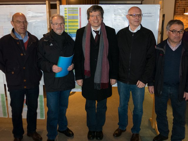 Im Rahmen seiner Tour durch den Landkreis besuchte Hans-Peter Daub am 14. März auch den Dorf-Treff in Rhade. Empfangen wurde er vom Dorf-Treff-Team, bestehend aus Rolf Heinz, Dieter Spreckels und Horst Schäfer, sowie Thomas Czekalla und Fred Bollmeier als Gemeindevertreter. Nach einer Führung durch das Gebäude zeigt sich Hans-Peter Daub sehr interessiert an dem Projekt „Dorf-Treff” und ließ sich die einzelnen Entwicklungsschritte seit dem Schließen des „Jägerhauses” im Januar 2010 genau erläutern, stellte Fragen zu den Zielen des Projektes, zur konkreten Umsetzung einzelner Ziele, zur Finanzierung und zeigte sich beeindruckt von der umsichtigen Planung. Besonders angetan schien Herr Daub von den verschiedenen Säulen des Projektes: Nahversorgung, Café, Kultur, Dorfgemeinschaftshaus, Jugendraum und soziales Netzwerk für verschiedene Generationen unter einem Dach!